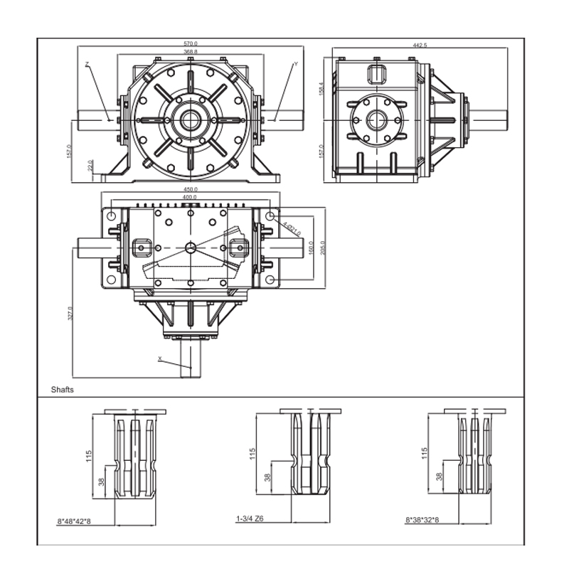 Převodovka zadává napájení předního svislého boxu stroje nebo traktoru, zvyšuje rychlost rotace a přenáší napájení do drtivé řezací hřídele přes převodovku a pás. Provozní šířkou stroje může prostřednictvím oboustranného výstupu dosáhnout 3,5 metrů až 6,5 metrů. Současně si také může realizovat funkci sekundárního drcení, aby se dosáhlo lepšího účinku drcení na plodiny. Stroj rozdrtí oříznutou slámu a poté recykluje balíčky a znovu ji použije, nebo ji přímo vrátí do standardu krmiva, nebo ji přímo vrátí do pole, aby se hnilo, aby se zvýšila plodnost půdy. Tento typ převodovky se použije v drtivých zařízeních různých zařízení, jako jsou malé čtvercové balíky, prachové remorující malé čtvercové balíky, kulaté balíky, zpětné stroje na slámu atd.
